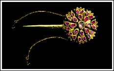 Ha la forma di un fiore a sei petali. Il pennacchio decorato con oro e rubini è lavorato con la tecnica a sbalzo e con l’incisione. La parte superiore del manico è decorata da fiori. La parte interna delle foglie che formano il corpo del pennacchio è ornata dai rubini applicati nei castoni. Due catene, con ganci ai bordi, sono saldate al corpo, per consentire al pennacchio di mantenersi dritto sopra il turbante. Infatti, i pennacchi che si trovano, come questo esposto alla mostra del Quirinale, nella collezione del Museo delle Arti Turche e Islamiche di Istanbul appartenevano a sultani, a principi o a membri della dinastia imperiale ottomana. Quando un membro della dinastia moriva, anche il suo pennacchio lo seguiva nel suo mausoleo. L’esemplare esposto, del XVII secolo, proveniva in origine dal mausoleo türbe del sultano Ahmet I, anche se non si sa di preciso a quale membro della dinastia appartenesse.
