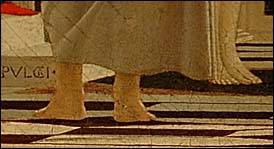 D'altra parte, mi pare, solo se fossero nudi -e, dunque, palesemente trasgressivi di un codice iconografico consolidato- dovremmo ritenre che a quei piedi Piero abbia affidato il compito di alludere ad altro: verosimilmente proprio alle mire del sultano di "scalzare" l'imperatore bizantino.